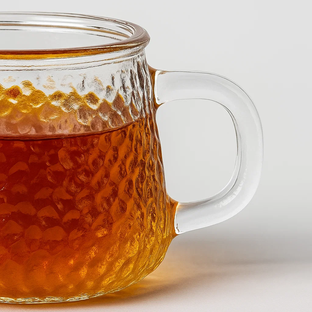 كوب زجاجي عالي الجودة بتصميم مُطرَّق يمنحك مزيجًا من الجمال والبساطة في كل رشفة. مصنوع من زجاج متين يتحمّل الحرارة، وشفافيته تبرز لون مشروبك بشكل راقٍ.